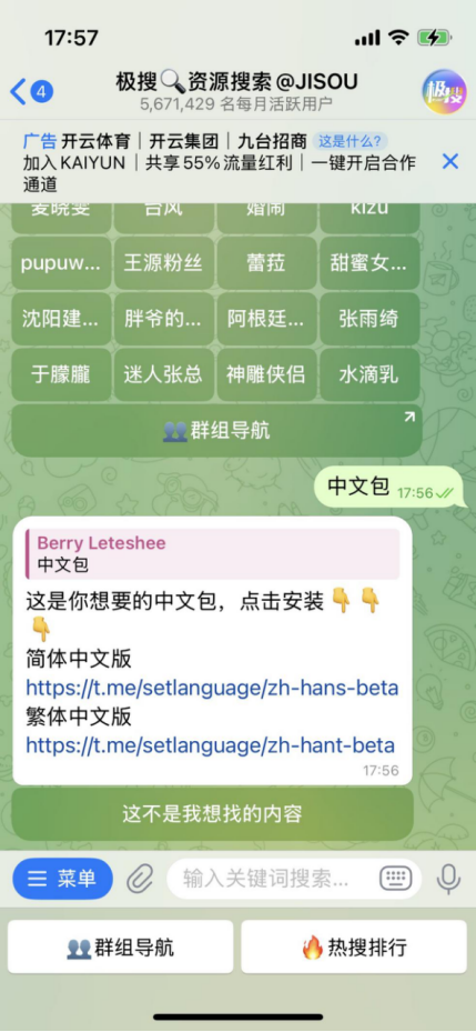 找到手机号选择好地区不能使用+86这个是国内的手机号段发送验证码 第二步复制链接打开浏览器 输入验证码+密码图3 Telegram中文设置方法 步骤 1:打开 Telegram 并登录 打开 Telegram App 并使用您的账号登录。 步骤 2:进入 Telegram 中文群组搜索机器人 看图4